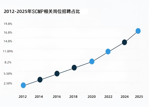 2012-2025年SCMP相关岗位招聘占比持续攀升,根据目前企业招聘形势,随着企业对供应链人才需求的不断增加,近